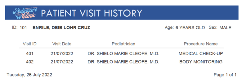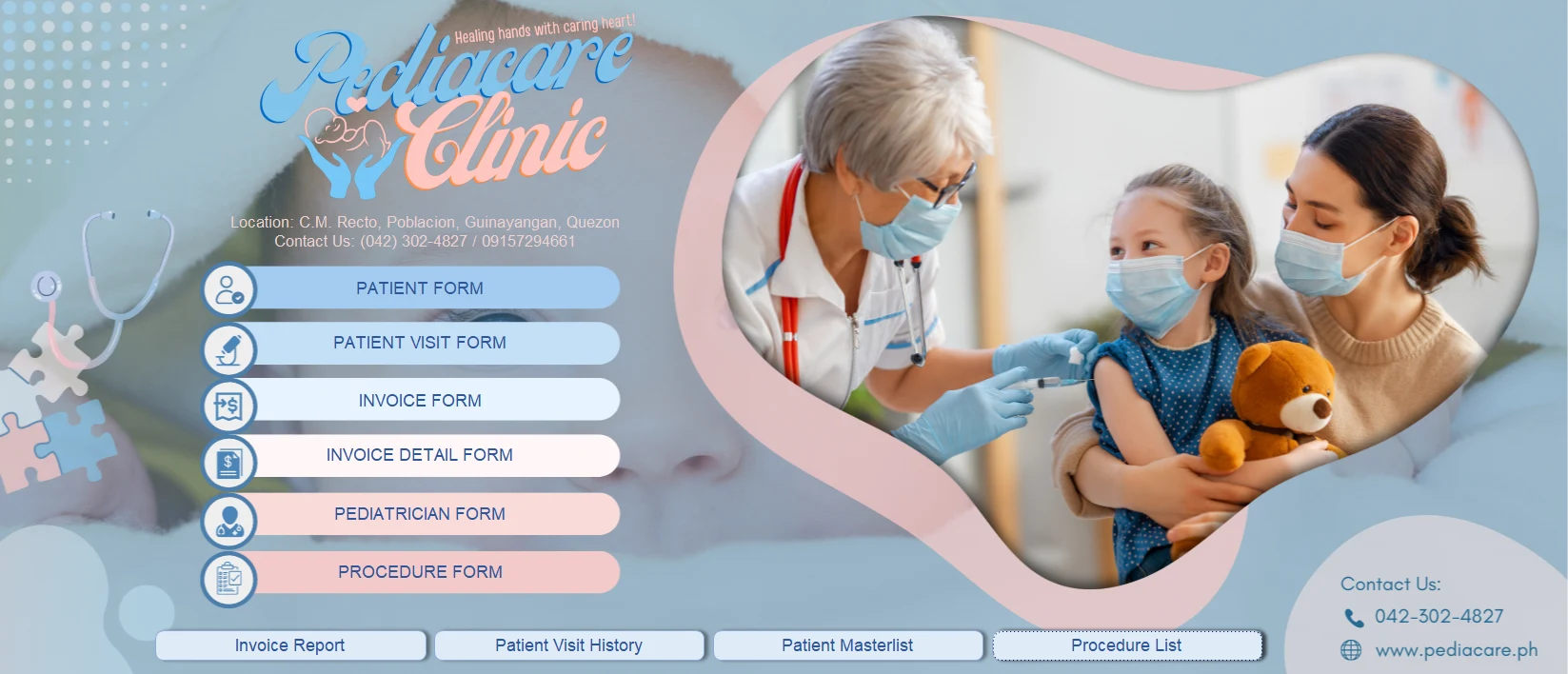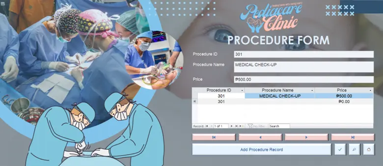 MS Access-based database managing patient records, visits, procedures, and invoices for pediatric clinics.