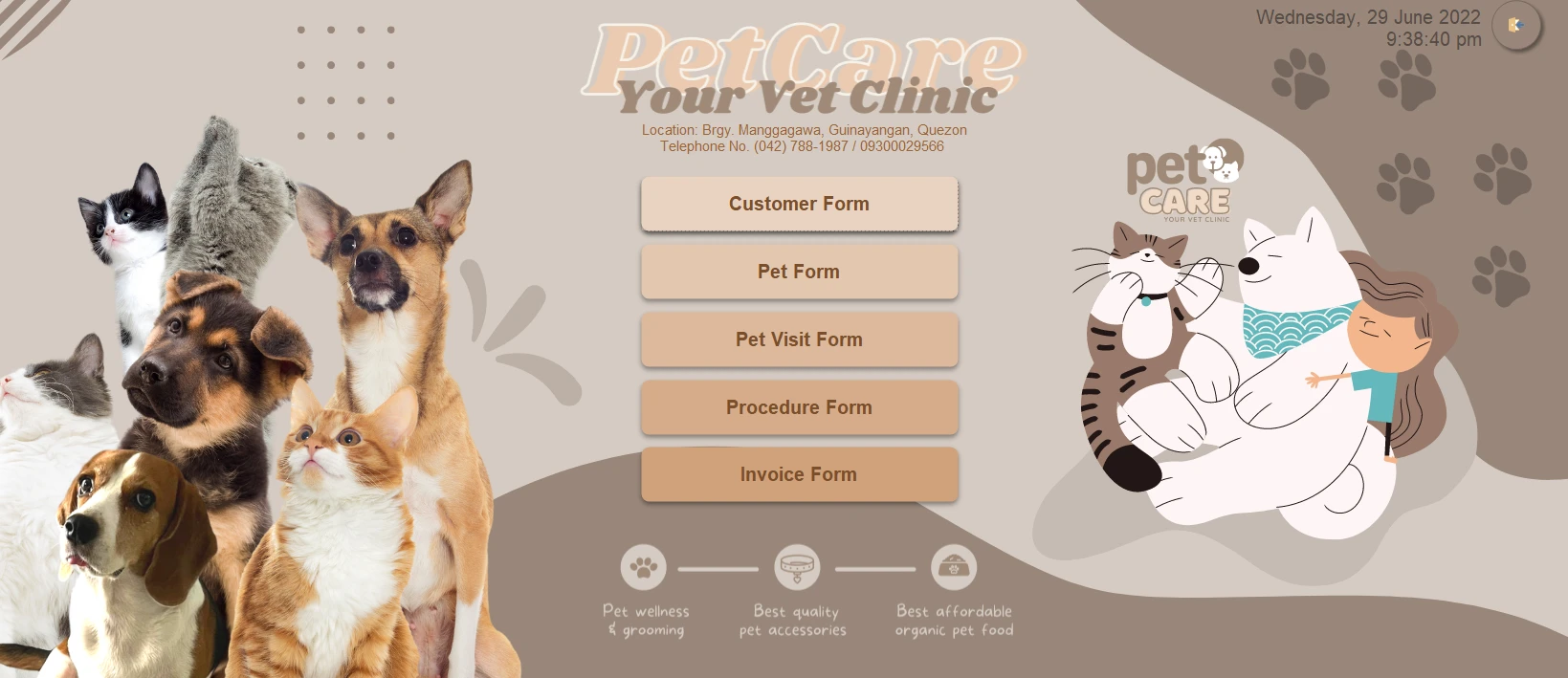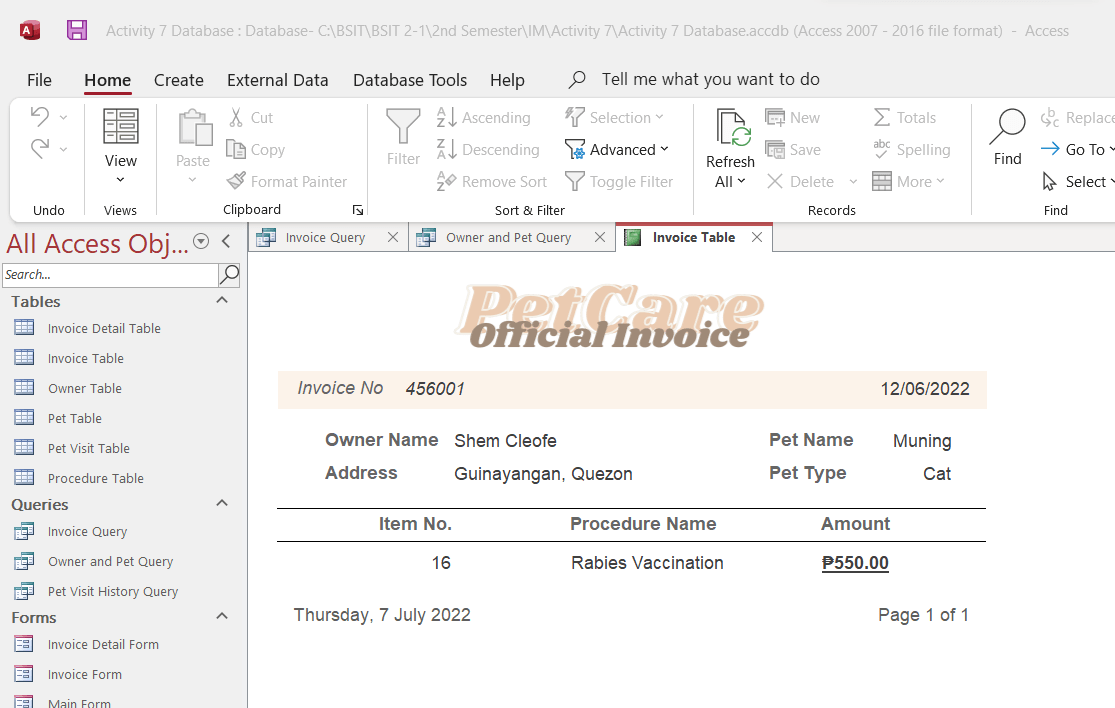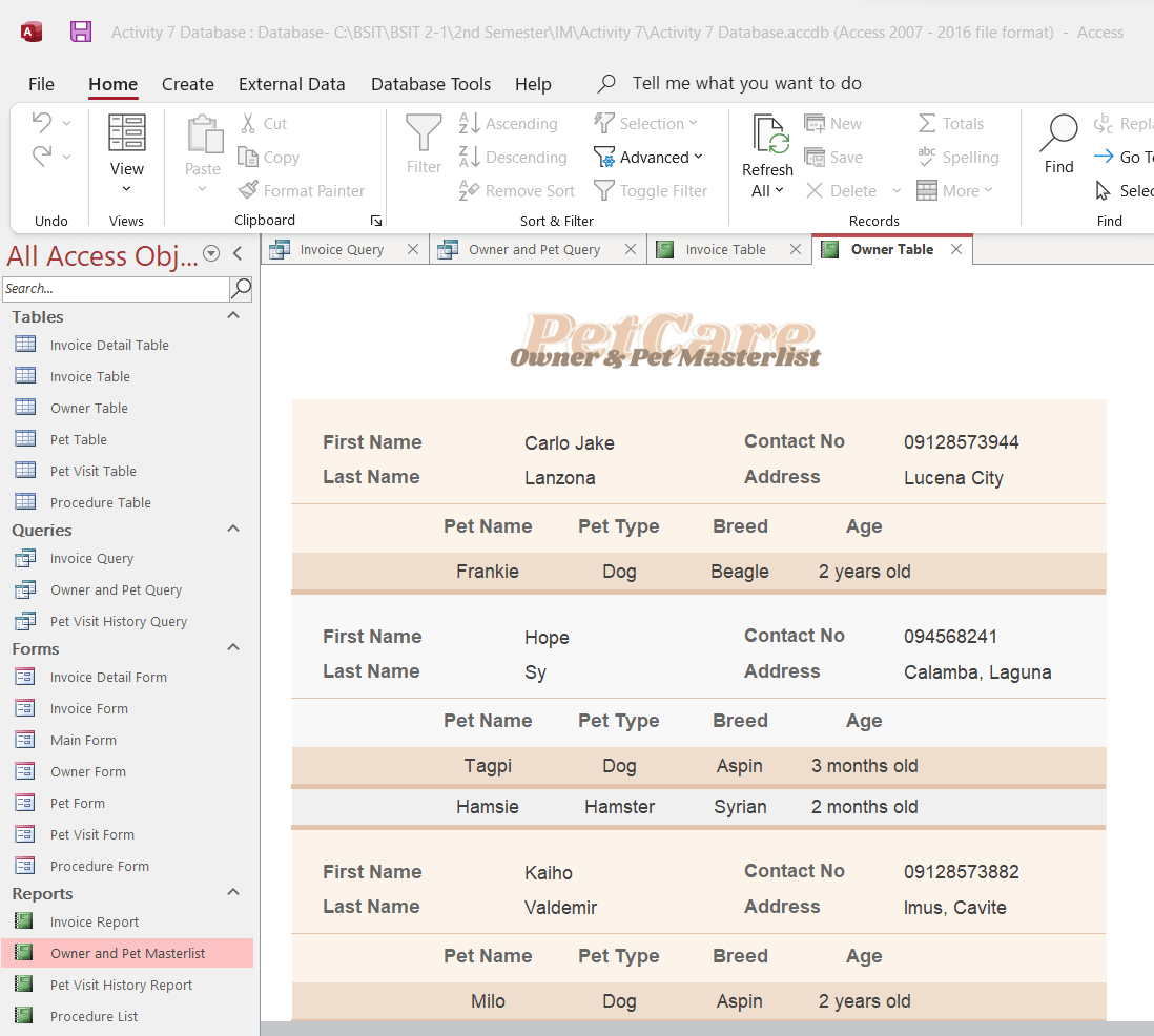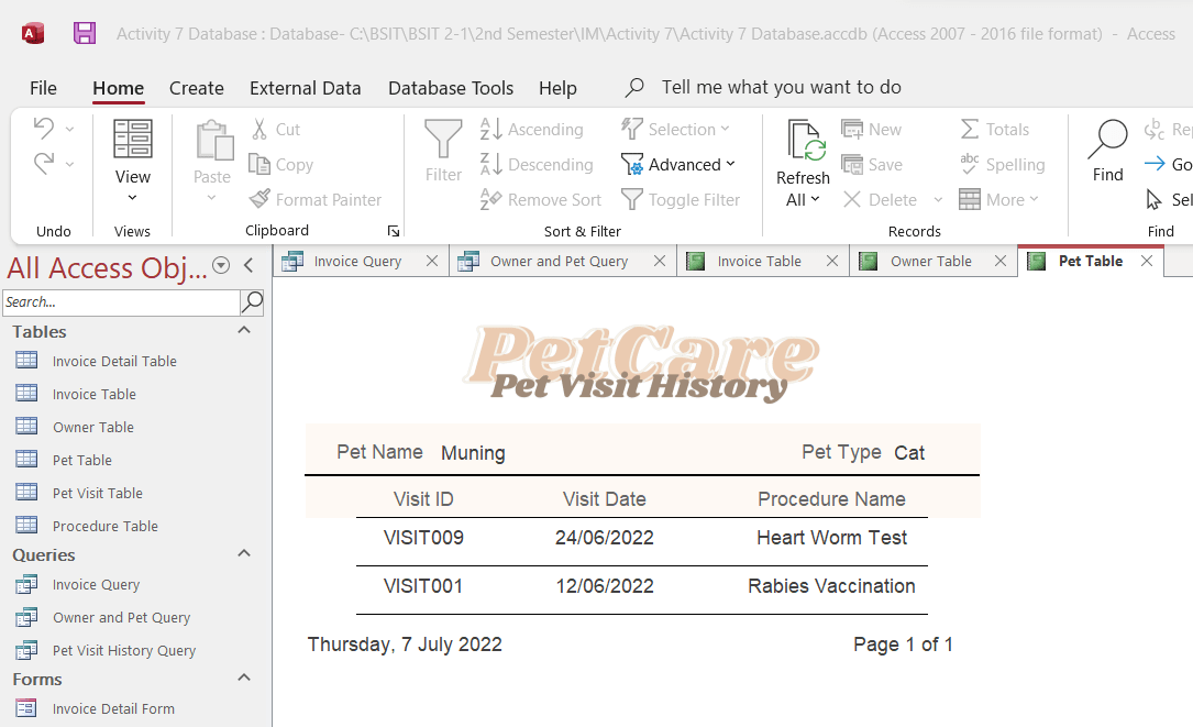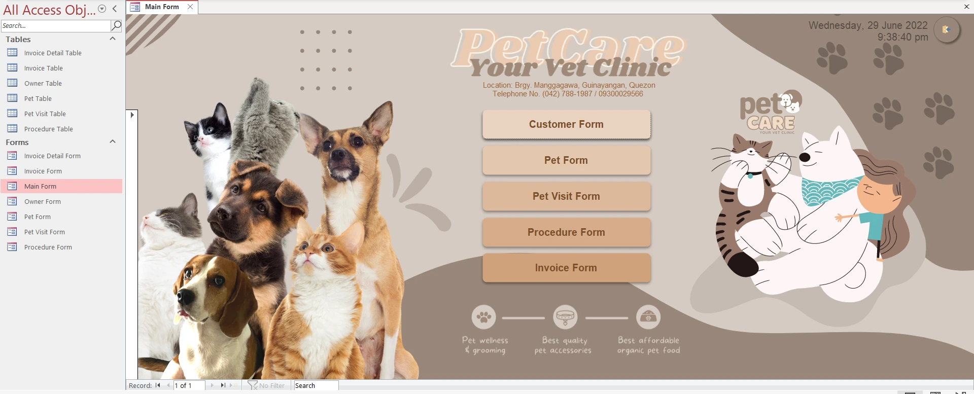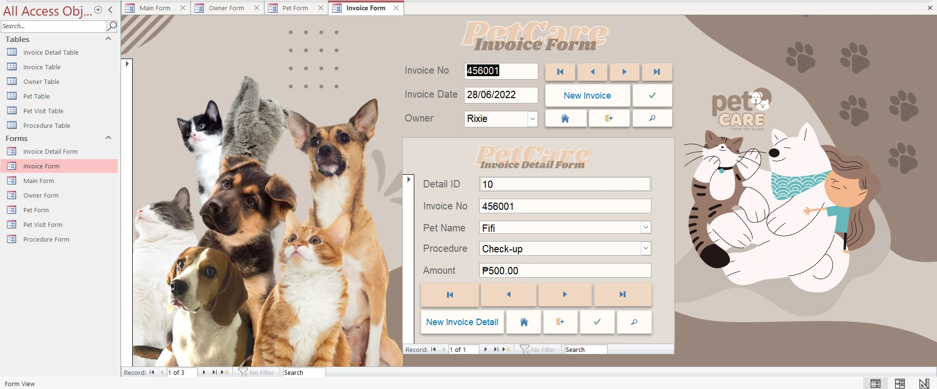 MS Access system to manage pet records, visits, owner info, procedures, and invoices.